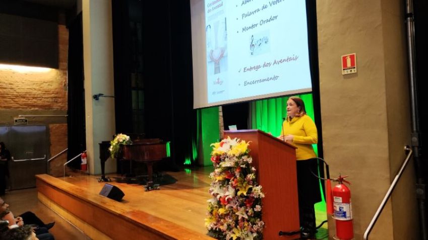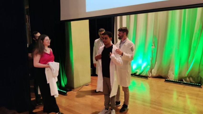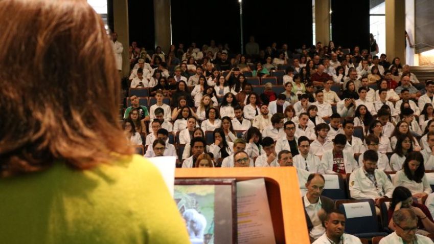 Durante o encontro, que pela primeira vez também contou com a presença de pais e responsáveis, os mentores vestiram os aventais nos 142 calouros, em um gesto que simboliza essa passagem.