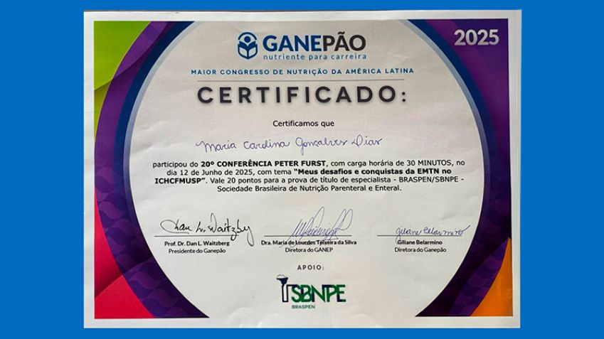 Com cerca de 500 publicações científicas, atuação em cinco continentes e participação nos conselhos editoriais das principais revistas da área, Peter Fürst deixou um legado inestimável à ciência da nutrição. A homenagem á nutricionista do ICHC, Maria Carolina Gonçalves Dias representa não apenas um reconhecimento individual, mas também um marco institucional para o ICHC e para a nutrição hospitalar brasileira.