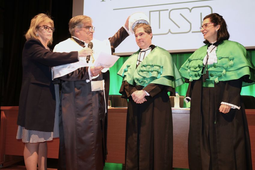 Em sua fala ao público, a Diretora da FMUSP, Eloisa Bonfá, exaltou o valor da ciência e da gestão inspiradora. Aos professores, ela desejou que suas gestões não só realizem conquistas acadêmicas, mas também promovam transformações pessoais e na sociedade, além de estimulá-los a atuar como exemplo inspirador aos profissionais de saúde e estudantes, para que possam desenvolver uma visão mais ampla do mundo e de responsabilidade social.