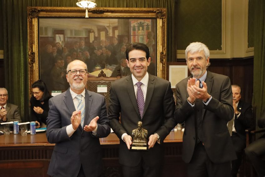 Já o Eng. Tom Zé, Superintendente do HC, exaltou o papel do TCU no fortalecimento da confiança da população nas instituições públicas. Dantas agradeceu o contato iniciado pelo Dr. Arnaldo Hossepian Júnior, diretor-presidente da FFM, que foi fundamental para uma maior clareza do funcionamento e necessidades das instituições. E reiterou o foco em encontrar soluções adequadas e justas para apoiar a gestão e prestigiar aqueles que trabalham na Faculdade e no HC. A cerimônia contou com a presença de autoridades, professores, estudantes e funcionários. Ao final, o ministro recebeu das mãos do Dr. Arnaldo e do Prof. Dr. Paulo Pêgo, vice-diretor da FMUSP, uma miniatura do busto de Arnaldo, fundador e primeiro diretor da FMUSP.