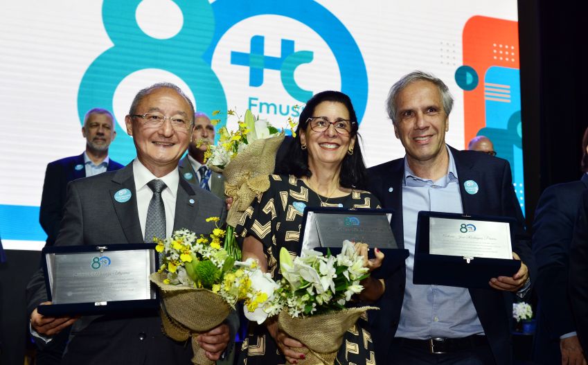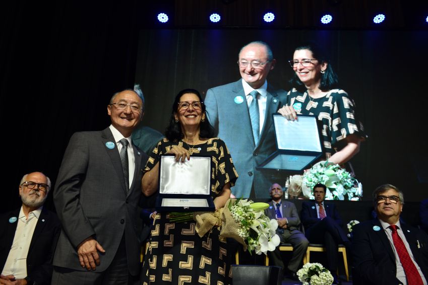 A sequência de homenagens prosseguiu com a Profª. Drª. Eloísa Silva Dutra de Oliveira Bonfá recebendo placa das mãos do Diretor Clínico, Prof. Dr. Edivaldo Massazo Utiyama. Primeira mulher a assumir a Direção da FMUSP, a Profª. Drª. Eloísa Bonfá atuou por 10 anos como Diretora Clínica do Hospital das Clínicas, dos quais os dois últimos liderando as equipes de combate à pandemia da Covid-19, considerado o desafio mais crítico da Medicina mundial.