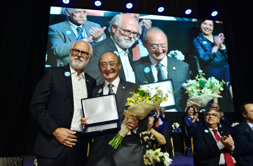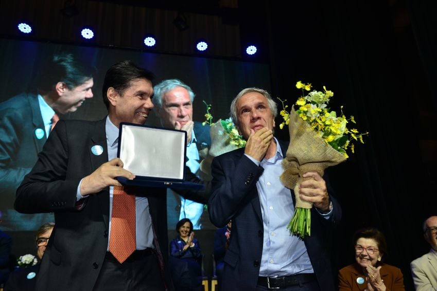 Em seguida, o Presidente do Conselho Diretor do Instituto de Ortopedia e Traumatologia e Vice-Presidente da Fundação Faculdade de Medicina, Prof. Dr. Tarcísio Eloy Pessoa de Barros Filho entregou a placa ao Superintendente do HCFMUSP, Engº. Antonio José Rodrigues Pereira. Essa homenagem destacou a atuação do Superintendente em moldar um novo modelo de Gestão Corporativa sob o dinamismo das inovações e sustentabilidade.