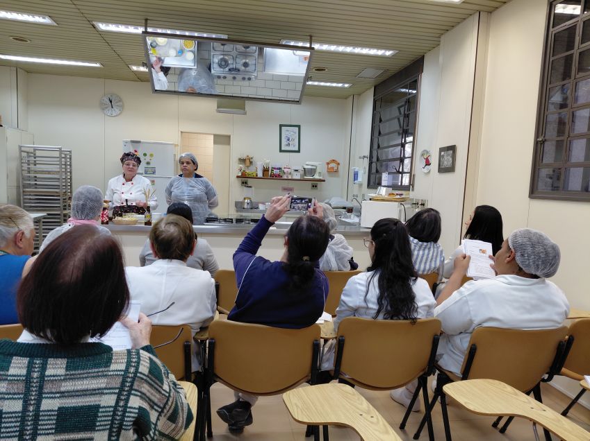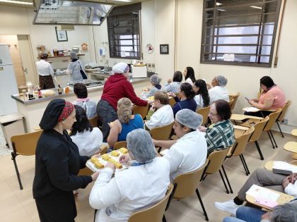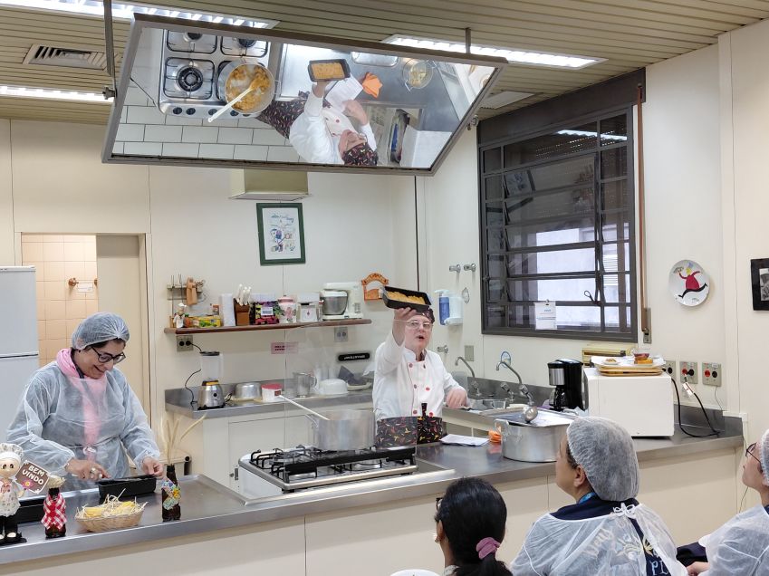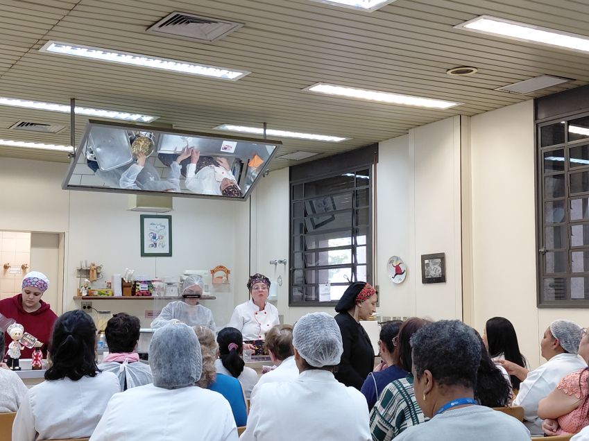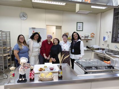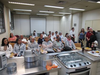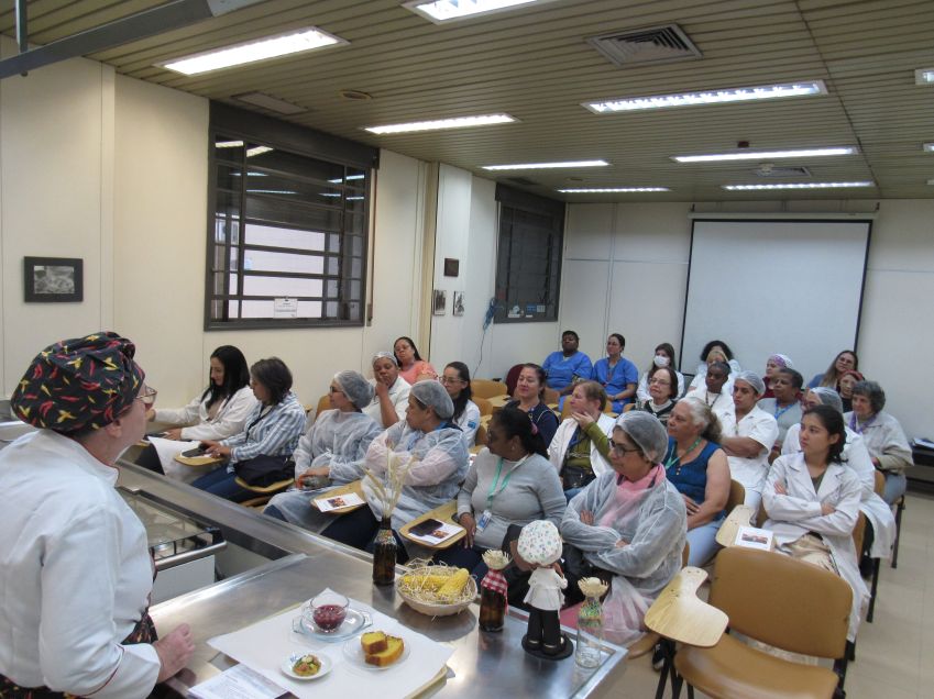 Em clima descontraído e de confraternização, a Profa. Dra. Andréa Luiza Jorge, Nutricionista Chefe da Seção de Cozinha Experimental do ICHC, conduziu a aula falando sobre as festas e a herança cultural e regional dos alimentos.