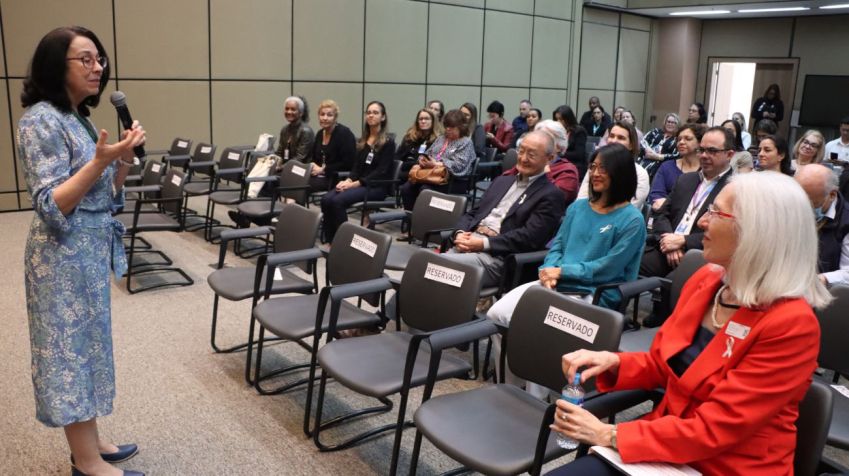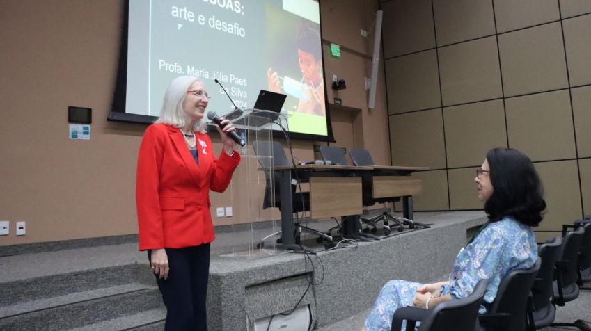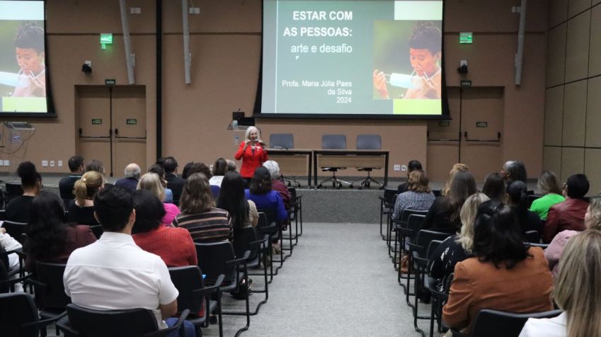 Palestra sobre o tema “Estar com as pessoas: Arte e Desafios” foi proferida pela Profª. Drª. Maria Júlia Paes da Silva, Titular Aposentada pela USP. Ela é especialista em comunicação interpessoal e humanização na área de saúde.