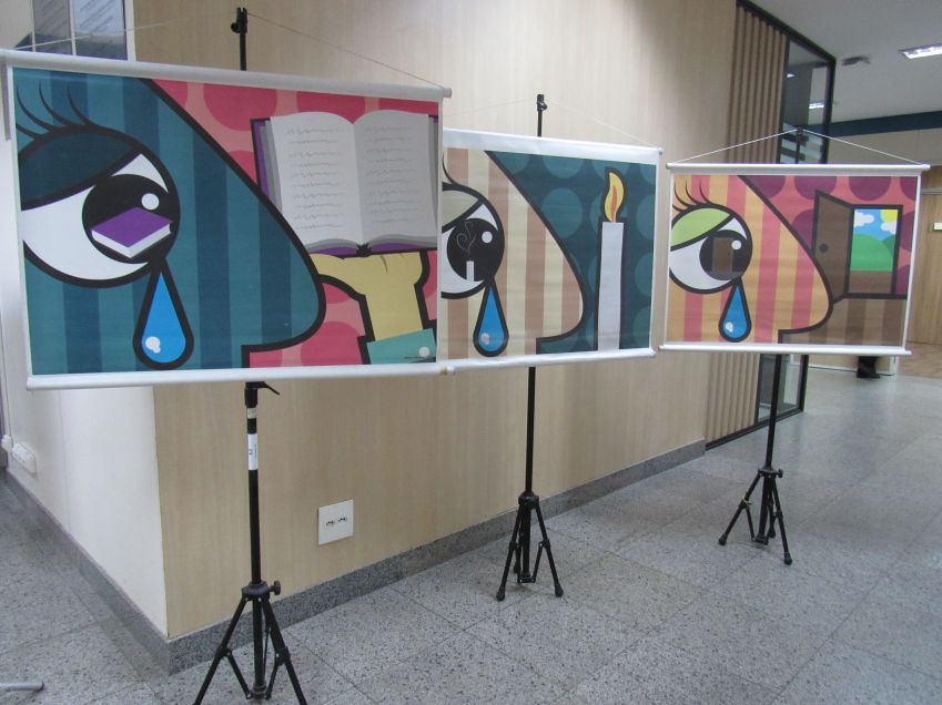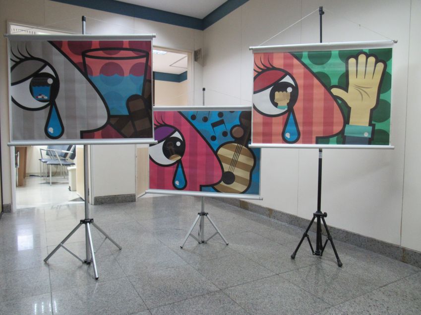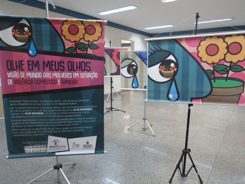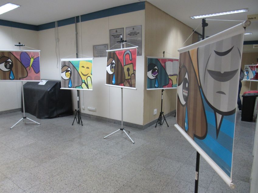 No Centro de Ensino Berilo Langer, a exposição “Olhe em Meus Olhos” reuniu 16 pinturas sobre visões dos impactos da violência de gênero, trazendo de forma lúdica um olhar sobre a saúde física e mental de mulheres e seu entorno