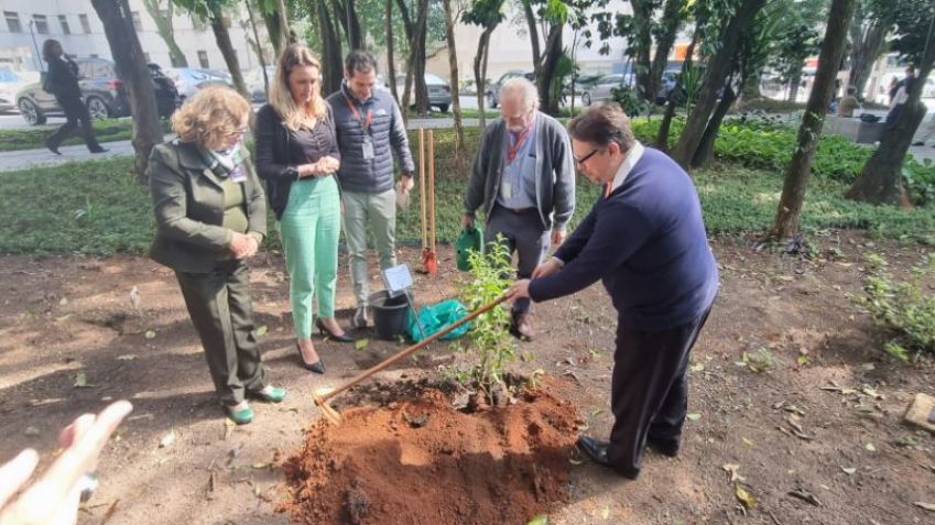 A muda recebeu nova morada pelas mãos do Presidente do Conselho Diretor (Condir), Prof. Dr. Nelson de Luccia; pelo Diretor de Corpo Clínico, Dr. Marcelo Rocha; pela Diretora Executiva, Dra. Daniele Pedroni; pelo Arquiteto Luis Robles e pela gestora de resíduos da Unidade, Enfermeira Cleonice Bezerra.