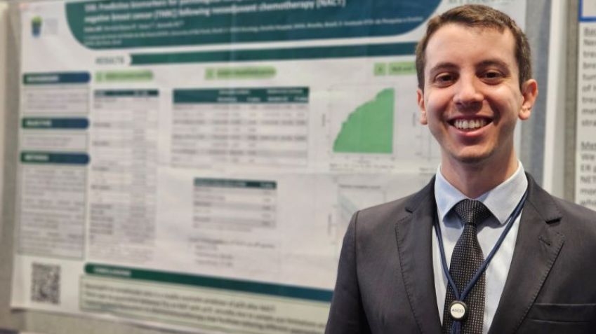 Durante o encontro, especialistas do Instituto também apresentaram trabalhos científicos promissores na área da Oncologia. Foi o caso do residente do 3º ano, Dr. Gabriel Polho, que junto da chefe do grupo de Oncologia Mamária do Icesp, Dra. Laura Testa, e da médica assistente da Oncologia Clínica do Icesp, Dra. Renata Bonadio, apresentaram um estudo de “Biomarcadores preditores de resposta patológica completa após quimioterapia neoadjuvante no câncer de mama triplo negativo inicial”.