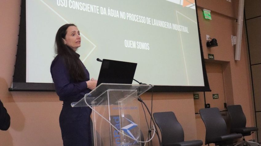 A palestra sobre “Economia e Tratamento da Água no Processo de Lavanderia Industrial” foi apresentada por Vivian Drezza - Gerente de SSMA (sigla de Saúde, Segurança e Meio Ambiente) da Elis. Essa empresa especializada em lavanderia hospitalar e industrial por quilo atua há 130 anos no mercado internacional.