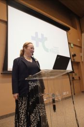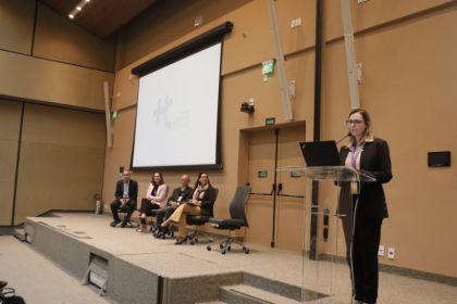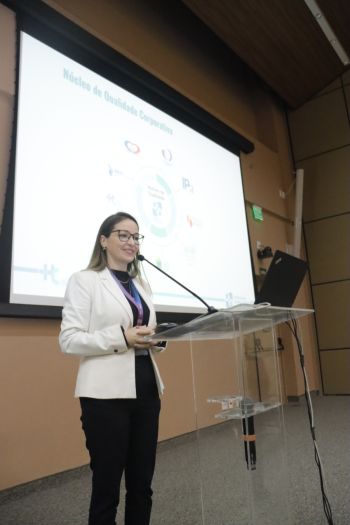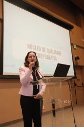 A Coordenadora do Núcleo de Qualidade Corporativa, Amanda Coelho Fernandes apresentou toda a estrutura, as diretrizes, a previsão de atividades e as entregas já realizadas pelo novo órgão, como a publicação de políticas corporativas que fortalecem a padronização e a integração das práticas de qualidade no HCFMUSP.