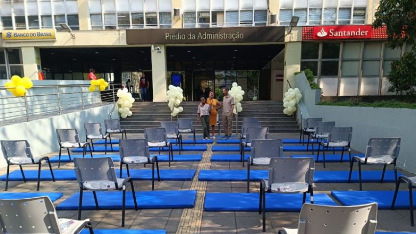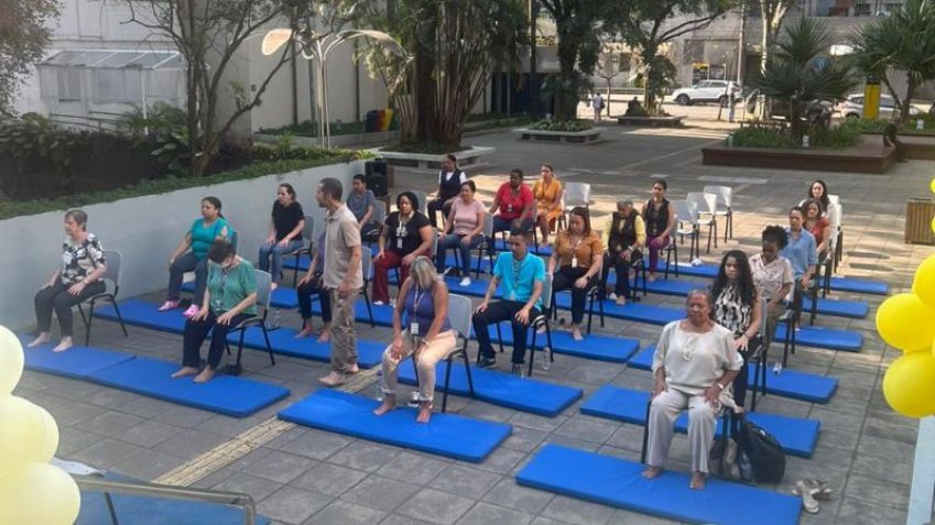Os colaboradores interessados em conhecer a prática da yoga foram recebidos pela equipe idealizadora e pelo Professor Edson, que conduziu a ação ensinando técnicas que auxiliam na harmonização das emoções, no autocuidado e favorecem um bom clima organizacional.