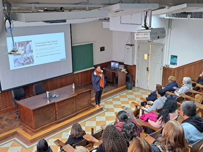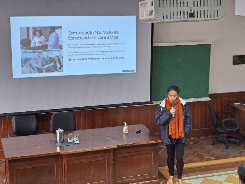 O tema “Comunicação não violenta” buscou a reflexão sobre como promover a compreensão, a colaboração e a empatia nas relações pessoais e profissionais para uma comunicação mais consciente e respeitosa.