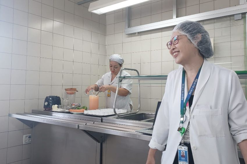 As nutricionistas do Serviço de Nutrição e Dietética do Instituto de Ortopedia (IOT), Simone Oku e Michele Ferreira, promoveram uma oficina para falar sobre a importância da hidratação para o organismo e ensinar os colaboradores a preparar um refrigerante caseiro e saudável.