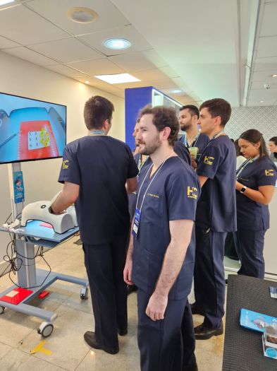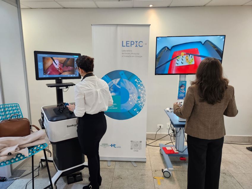 Participantes puderam realizar exercícios de coordenação nos dois simuladores de treinamento em videolaparoscopia disponibilizados para o evento