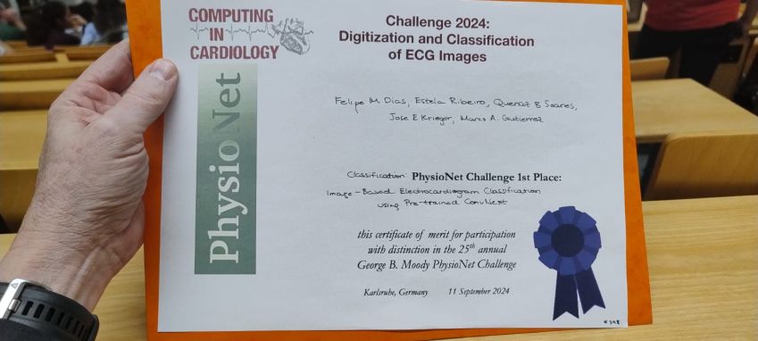 A equipe liderada pelo Prof. Dr. Marco Antônio Gutierrez e pelo Prof. Dr. José Eduardo Krieger ganhou o Prêmio Internacional “George Moody Physionet Challenge 2024" com o melhor algoritmo por Inteligência Artificial (IA) para classificar automaticamente 11 tipos de arritmias, a partir de qualquer imagem de ECG em 12 derivações.